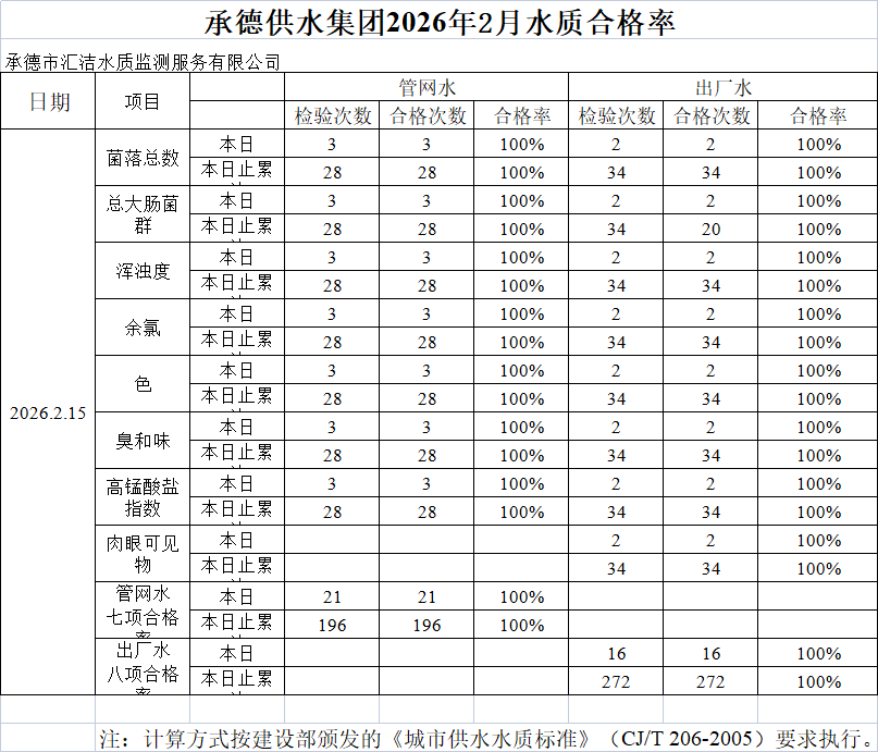 承德供水集團(tuán)2026年2月15日水質(zhì)合格率